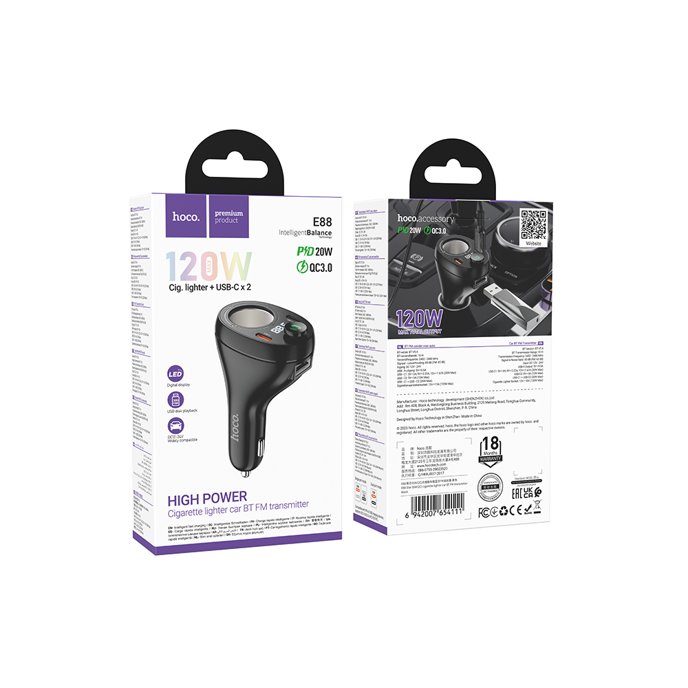 Технические характеристики Авто FM модулятор HOCO E88 (USB QC3.0/2PD 20W/дисплей) черный