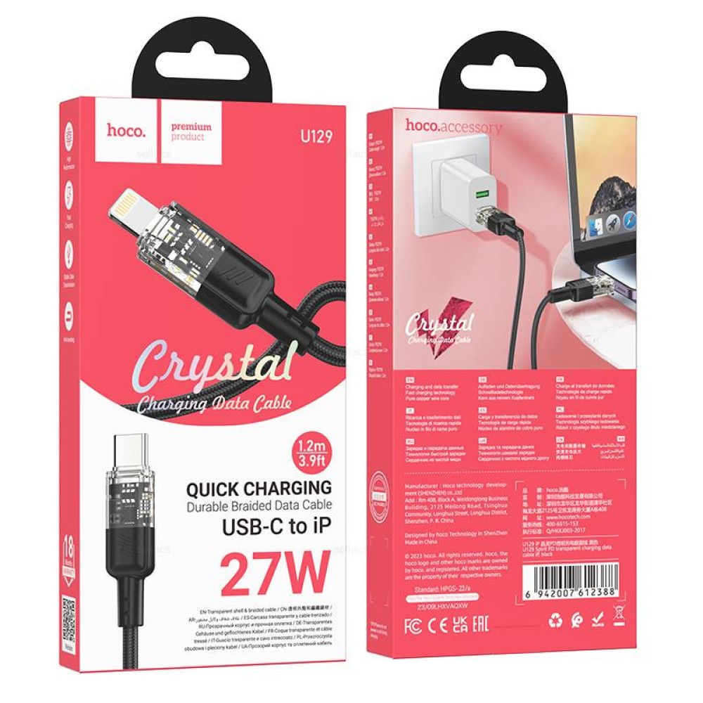 Кабель Lightning - Type-C HOCO U129 (27W/3A/1.2m/текстиль) черный