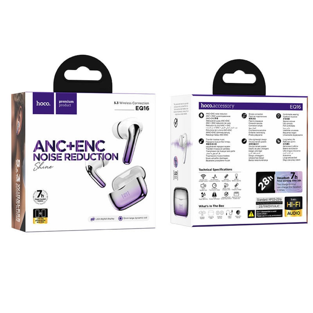 Технические характеристики Беспроводные TWS наушники HOCO EQ16 (7 ч/320 mAh) фиолетовые