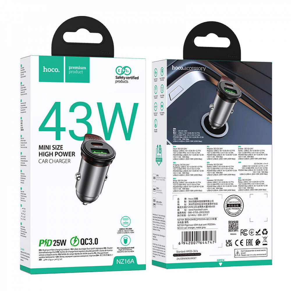Технические характеристики Автомобильное ЗУ HOCO NZ16A (USB QC3.0/PD 25W) серый металл