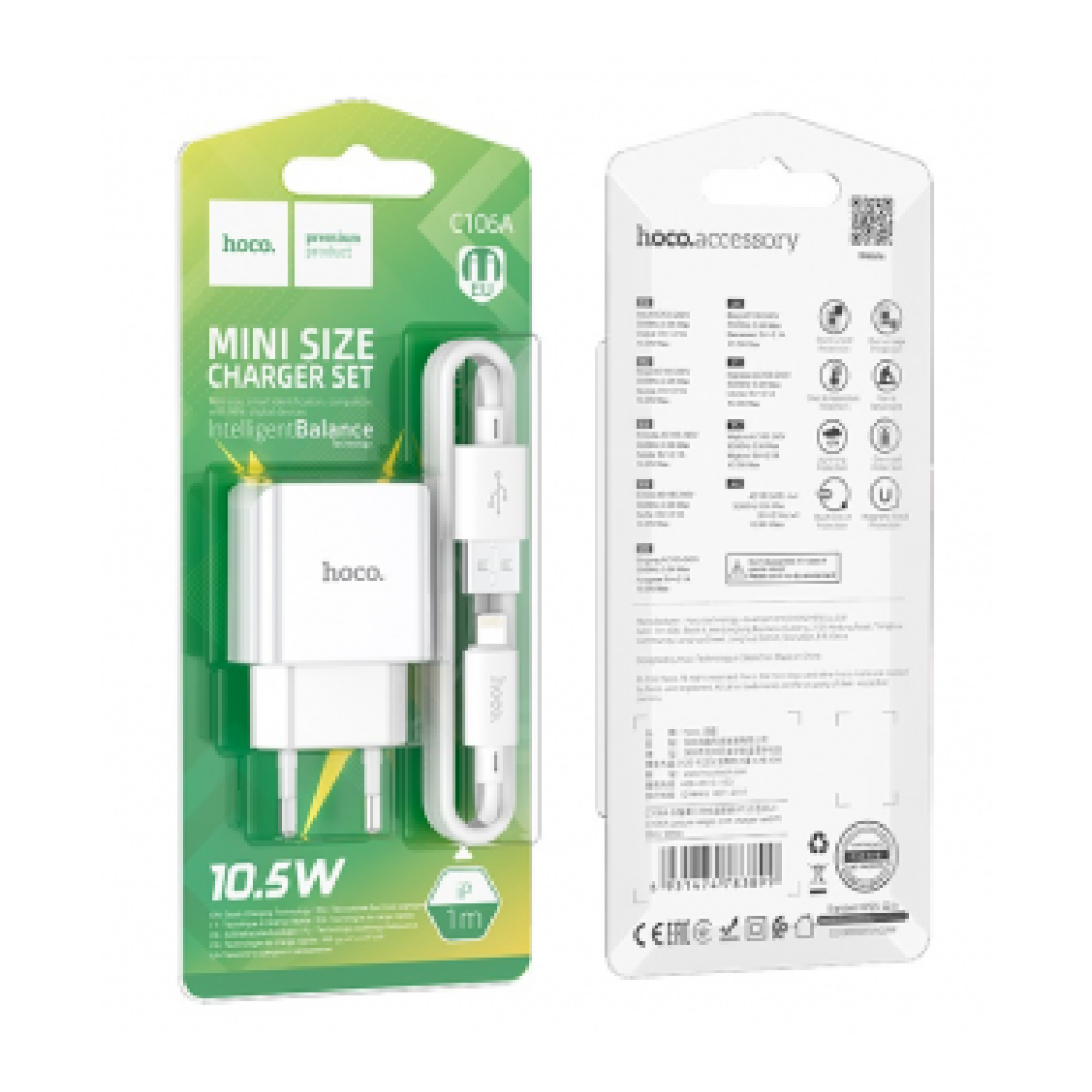 Сетевое зарядное устройство HOCO C106A с кабелем Lightning – это идеальное решение для быстрой и надежной зарядки ваших устройств. С мощностью 2.1A и одним USB-портом, оно обеспечивает высокую скорость зарядки, что позволяет вам быстро восстановить заряд вашего смартфона или планшета.