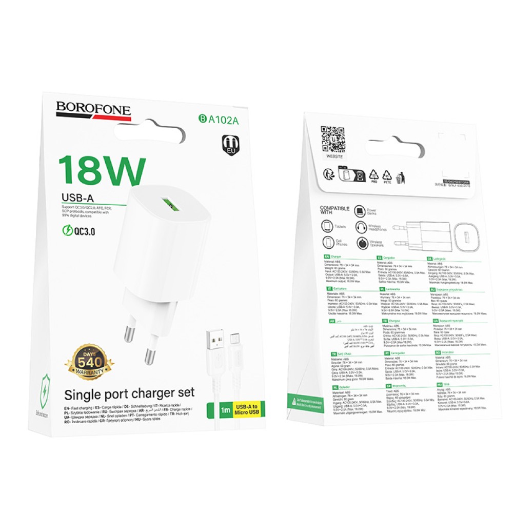 Сетевое ЗУ BOROFONE BA102A + кабель Micro USB (USB QC 3.0/18W) белое