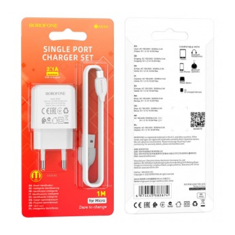 Сетевое зарядное устройство BOROFONE BA64A с кабелем Micro USB – это идеальное решение для быстрой и надежной зарядки ваших устройств. С мощностью 2.1A и одним USB-портом, данное зарядное устройство обеспечивает эффективную подачу энергии, позволяя вам быстро зарядить смартфоны, планшеты и другие гаджеты.