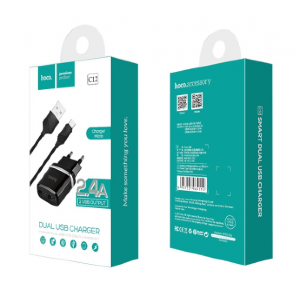 Сетевое ЗУ HOCO C12 + кабель Micro USB (2USB/2.4A) черное