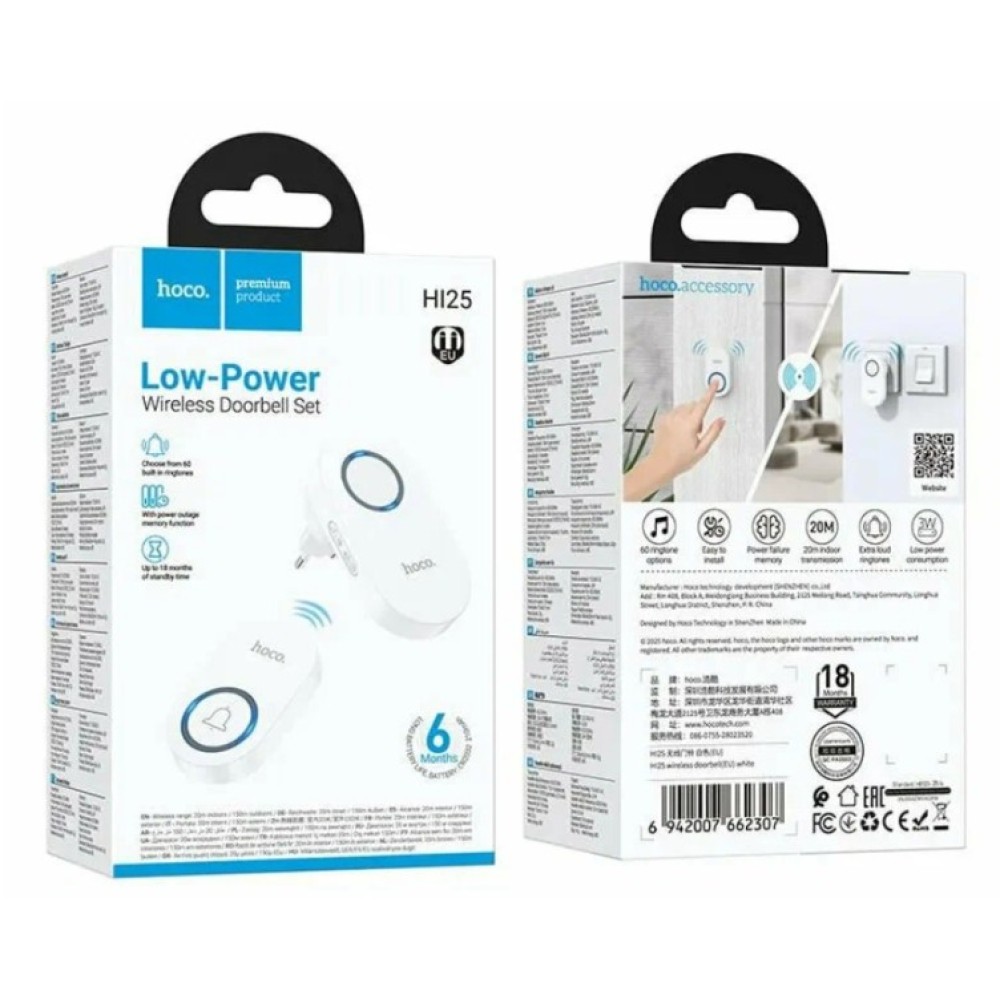 Технические характеристики Беспроводной дверной звонок HOCO HI25 белый