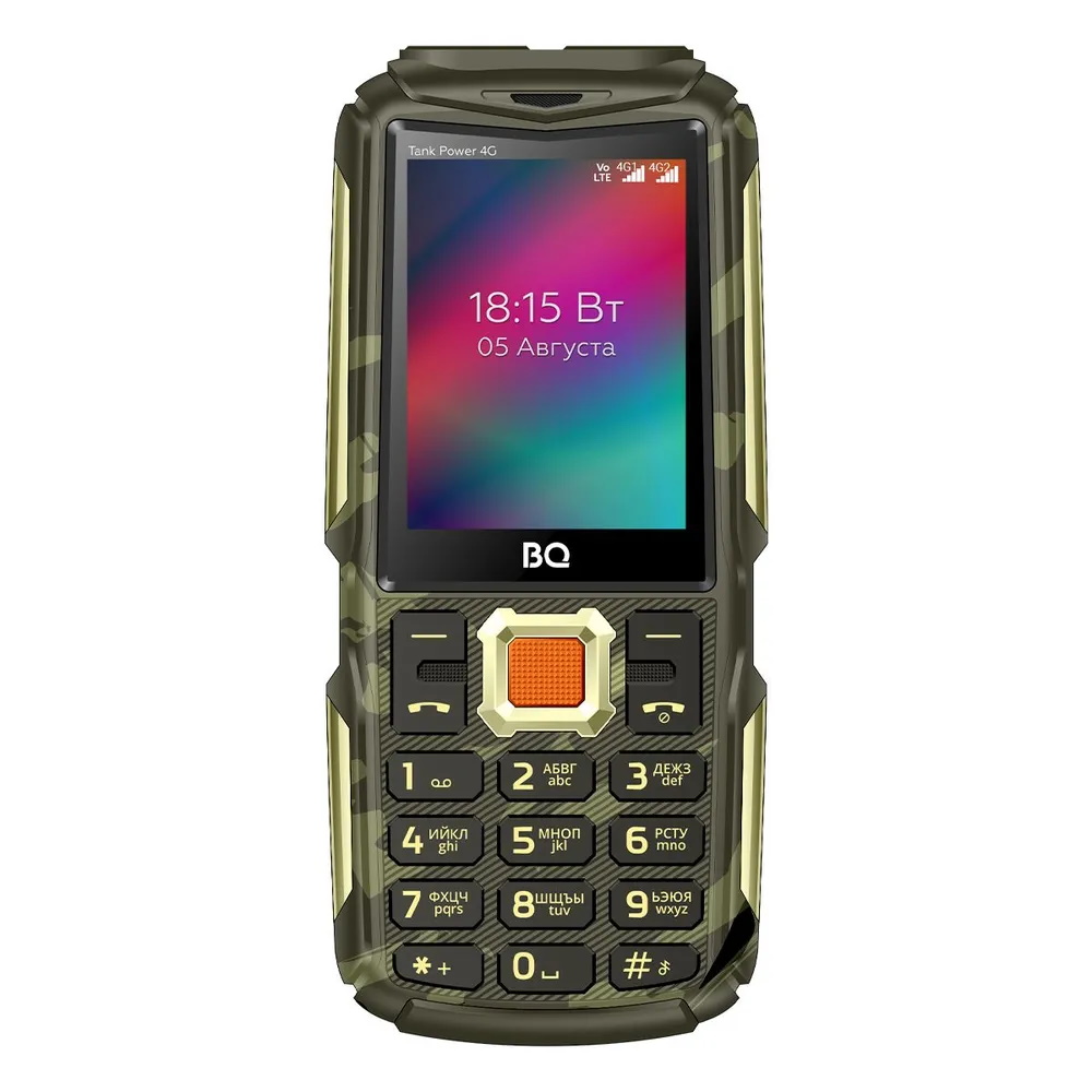 Надежный мобильный телефон BQ 2410L Tank Power в стильном камуфляжно-золотом исполнении